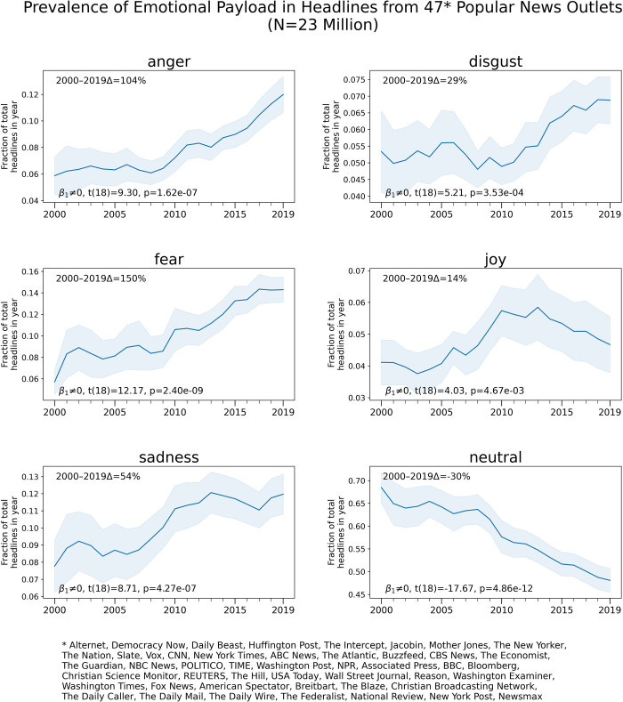 W 2022 r. pojawiły się wyniki badania, które analizowało nagłówki z amerykańskich mediów. Jasno z niego wynika, że newsy i wiadomości stają się coraz bardziej negatywne. Wyraźnie rośnie częstotliwość pokazywania gniewu, strachu, obrzydzenia, niebezpieczeństwa i smutku, a widać to szczególnie mocno w mediach o skrajnych poglądach. Tak to wygląda na zagregowanych danych: