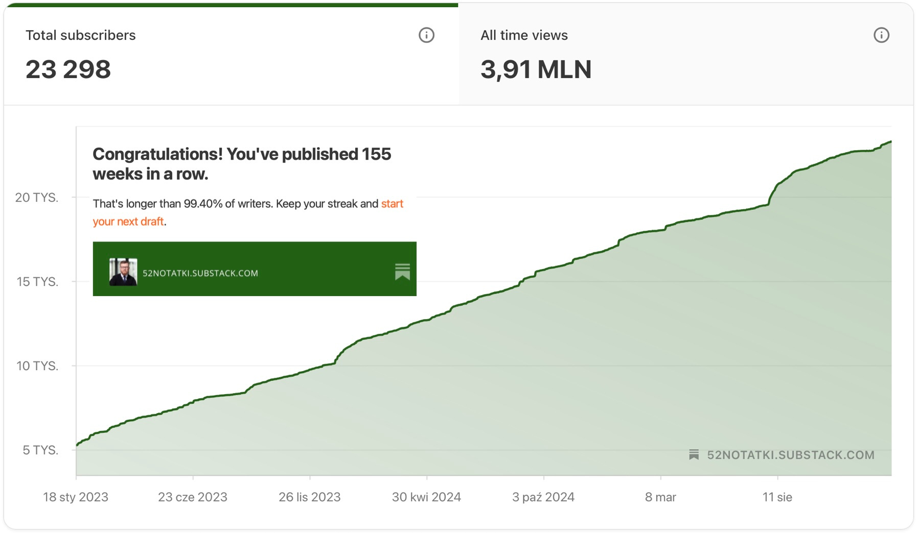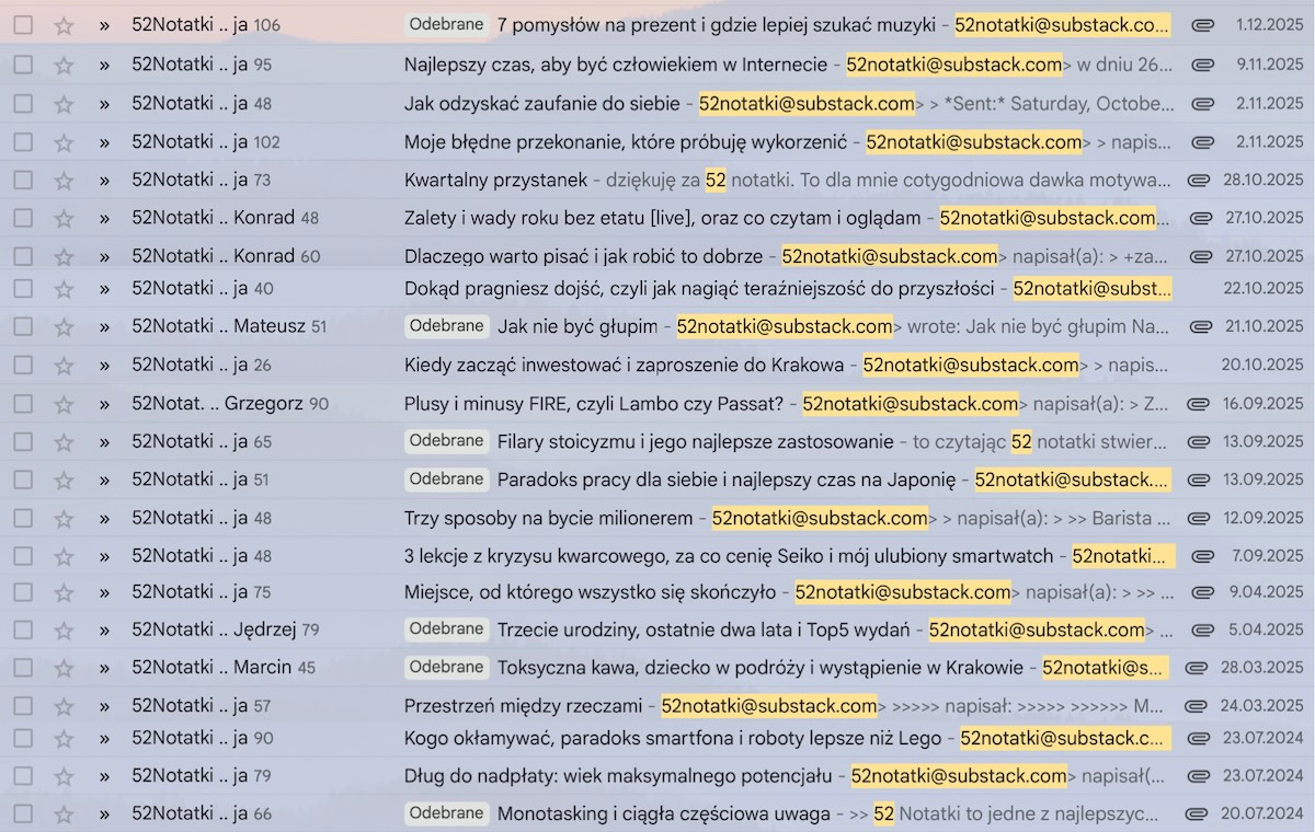 Piszę ten artykuł, ponieważ istnieje duża szansa, że jest to ostatni rok, kiedy prowadzę 52Notatki. Pomyślałem więc, że warto zebrać moje doświadczenia w tworzeniu newslettera, bo może w ten sposób pomogę komuś, kto sam chce zacząć publikować treści, które ja chętnie bym przeczytał.
